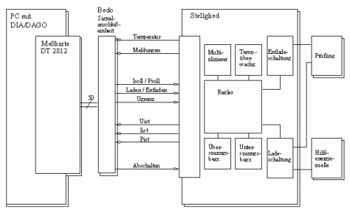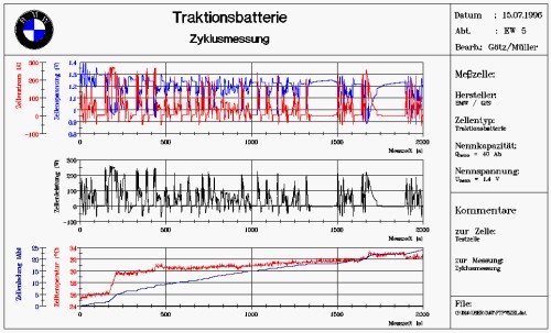 Autoren: Holger Müller, GfS mbH Aachen und Georg Götz, BMW AG, München Auf Grund zunehmender Luftverschmutzung bleibt die Traktionsbatterie für elektrisch angetriebene Fahrzeuge Gegenstand intensiver Forschung der Batteriehersteller. Infolgedessen werden Kfz-Hersteller, die sich mit Elektro- oder Hybridantrieben befassen, mit zahlreichen neuen Batterietechnologien und Zellvarianten unterschiedlichster Art und Leistungsparameter konfrontiert. Die Beschaffungskosten der verschiedenen Batterien, ihre Leistungsparameter sowie die erreichbare Lebensdauer bilden die zentralen Auswahlkriterien. Sie bestimmen die Fahrleistungen des Fahrzeuges und damit die Kundenakzeptanz. Um bei der Bewertung neuer Technologien die Prüfstands- und Prüflingskosten zu begrenzen und die Prüfstandsrüstzeiten zu minimieren, wurde bei BMW München ein Konzept zur Prüfung von Einzelzellen mit anschließender Hochrechnung der ermittelten Parameter auf die Gesamtbatterie realisiert. Die Anlage eignet sich auch zur Prüfung von Doppelschichtkondensatoren großer Kapazität (Supercaps), die in Kraftfahrzeugen zur Spitzenlastabdeckung eingesetzt werden. Zum Steuern des Prüfablaufs, zur Sollwertvorgabe sowie zur Visualisierung der Meßergebnisse wird die Standardsoftware DIA/DAGO genutzt, da sie sich durch ihren modularen Aufbau sowie die implementierten Customizing-Funktionen optimal an die Meßaufgabe anpassen läßt. Das Programm ist die Schnittstelle zum Anwender, realisiert als erste Ebene der Regelung die Sollwertvorgabe für Lade- und Entladevorgänge und steuert den Ablauf der Messung sowie die Aufnahme und Verarbeitung der Meßwerte. Die zweite Regelungsebene bilden die unmittelbar mit der Leistungselektronik verbundenen Analogreglerschaltungen auf der Basis von Operationsverstärkern. PC und Reglerschaltungen sind durch die Meßkarte DT 2812 von Data Translation und eine Bedo-Signalanschlußeinheit verbunden. Die Meßkarte verfügt über acht Analog-/digital-Eingänge, zwei Digital-/Analog-Ausgänge sowie jeweils 8 digitale Ein- und Ausgänge. Dementsprechend besteht die Signalanschlußeinheit aus jeweils einer achtkanaligen digitalen Ein- und Ausgangskarte, einer zweikanaligen D/A-Ausgangskarte sowie vier zweikanaligen A/D-Eingangskarten (Bild 1). Bild 1: Die Struktur des Versuchsstands zeigt die Verknüpfung von handelsüblichen Hard- und Softwarekomponenten mit speziell gefertigten Schaltungen. Meßablauf Der Meßablauf wurde selbsterklärend gestaltet, um einem wechselnden Benutzerkreis die Einarbeitung zu erleichtern. Nach dem Start des Programms DIA/DAGO auf dem PC kann der Bediener durch Aufruf verschiedener, an den Meßablauf angepaßter Menues den zeitlichen Verlauf des Lade- bzw. Entladevorgangs einer Batteriezelle und die gewünschte Sollgröße (Strom oder Leistung) frei vorgeben oder fest gespeicherte Leistungsprofile auswählen. Ein manueller Modus erlaubt zudem die Online-Sollwerteingabe über die Tastatur während der laufenden Messung. Abhängig von der erforderlichen Genauigkeit der Messungen können im Programm verschiedene Meßbereiche angewählt werden. Bei Aktivierung der entsprechenden Menüpunkte im Anwenderstrukturbild, das zugleich ein Inhaltsverzeichnis der jeweiligen Programmkomponente darstellt, startet eine Autosequenz, die eine Eingabemaske zur Vorgabe des energetischen Ausgangszustands des Prüflings öffnet, das zur Messung notwendige DAGO-Setup lädt, die Online-Darstellung der Meßwerte konfiguriert und über das Setzen von Variablen sowie das Generieren von Datenkanälen die Ausgabe von Steuerbefehlen (Laden oder Entladen, Sollwerte von Strom bzw. Leistung) durch die Meßkarte veranlaßt. Diese Signale werden durch die Signalanschlußeinheit übertragen und an das Stellglied angepaßt. In Abhängigkeit von Art und Größe des vorgegebenen Sollwerts und vom Istwert des Stroms bzw. der Leistung regelt die Lade- bzw. Entladeelektronik das Laden oder Entladen des Prüflings. Die Ladeenergie wird dabei von einer externen Spannungsquelle bereitgestellt. Als Schaltelemente dienen in beiden Fällen jeweils 30 parallelgeschaltete Power-MOSFET, die vom jeweiligen Regler direkt angesteuert werden. Neben den primären Funktionseinheiten existieren Baugruppen, die Hilfsfunktionen, wie Spannungsversorgung der Reglerschaltungen und Steuerung der zur Kühlung der Leistungselektronik eingesetzten Lüfter, realisieren. Betriebsparameter aus der Praxis Weil die unter Laborbedingungen (Konstantstromentladung, stabile Zellentemperatur, aufwendige Ladetechnik) gewonnenen Leistungsangaben der Batteriehersteller keine verläßlichen Rückschlüsse auf die mit der jeweiligen Batterie erreichbaren Fahrleistungen zulassen, werden die Batteriezellen unter betriebsnahen Bedingungen geprüft. Deshalb wurden als Ausgangspunkt für die Erarbeitung der Sollwertvorgaben genormte Fahrzyklen gewählt, wie sie bei Verbrennungskraftfahrzeugen zur Ermittlung des durchschnittlichen Kraftstoffverbrauchs zugrunde gelegt werden: ECE-Verbrauchs-, FTP-75-City- und Highway-Zyklus. Die Umrechnungen der als Geschwindigkeitsprofile definierten Verbrauchszyklen in Zeitverläufe der Leistung wurden mit Hilfe des bei BMW für den internen Einsatz entwickelten Simulationsprogramms FVV (Fahrleistungs- und Verbrauchsvergleich) durchgeführt. Der Berechnung lagen die im Programm enthaltenen Daten eines BMW 316i (E36) zugrunde. Die so ermittelten zeitlichen Verläufe der Leistung am Rad bildeten die Grundlage der Berechnung der notwendigen Motorleistung. Die Batterieleistung wurde auf der Basis von Daten einer Motor-/Umrichterbaugruppe der Firma Siemens ermittelt. Im Ergebnis der Berechnungen entstanden ASCII-Dateien mit Batterieleistungsverläufen, die - geladen und gespeichert in DIA-Kanaldateien - die Grundlage für zyklusgeführte Messungen bilden. Zur Messung einer einzelnen Zelle wird die Gesamtleistung entsprechend der Anzahl der Zellen einer Batterie aufgeteilt. Dies geschieht nach Eingabe der Zellenzahl durch den Nu